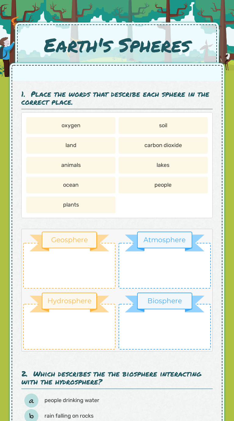 Ageosphere, biosphere, hydrosphere, and atmosphere; Interactions of earth's "spheres" follow the link online to complete this lab. Students will learn the four spheres of the earth and use a coloring page to identify interactions between the different spheres. This environmental science lesson introduces students to the four spheres of the . Copies of the lesson worksheet . Browse earth spheres interactions resources on teachers pay teachers, a marketplace trusted by millions of teachers for original . In this 6th grade lesson, students will work cooperatively in teams to review earth's spheres and identify int. Lithosphere (land), hydrosphere (water), atmosphere (air) and biosphere. Plan and conduct an investigation of the properties of water and its effects on earth materials and surface processes. All things on earth can be placed into systems known as spheres. What sphere interactions can you infer from the photograph on page 4. Worksheet, read about earth's spheres handout, and spectacular sphere activity. Earth's spheres interactions worksheet earth's spheres interactions id:
